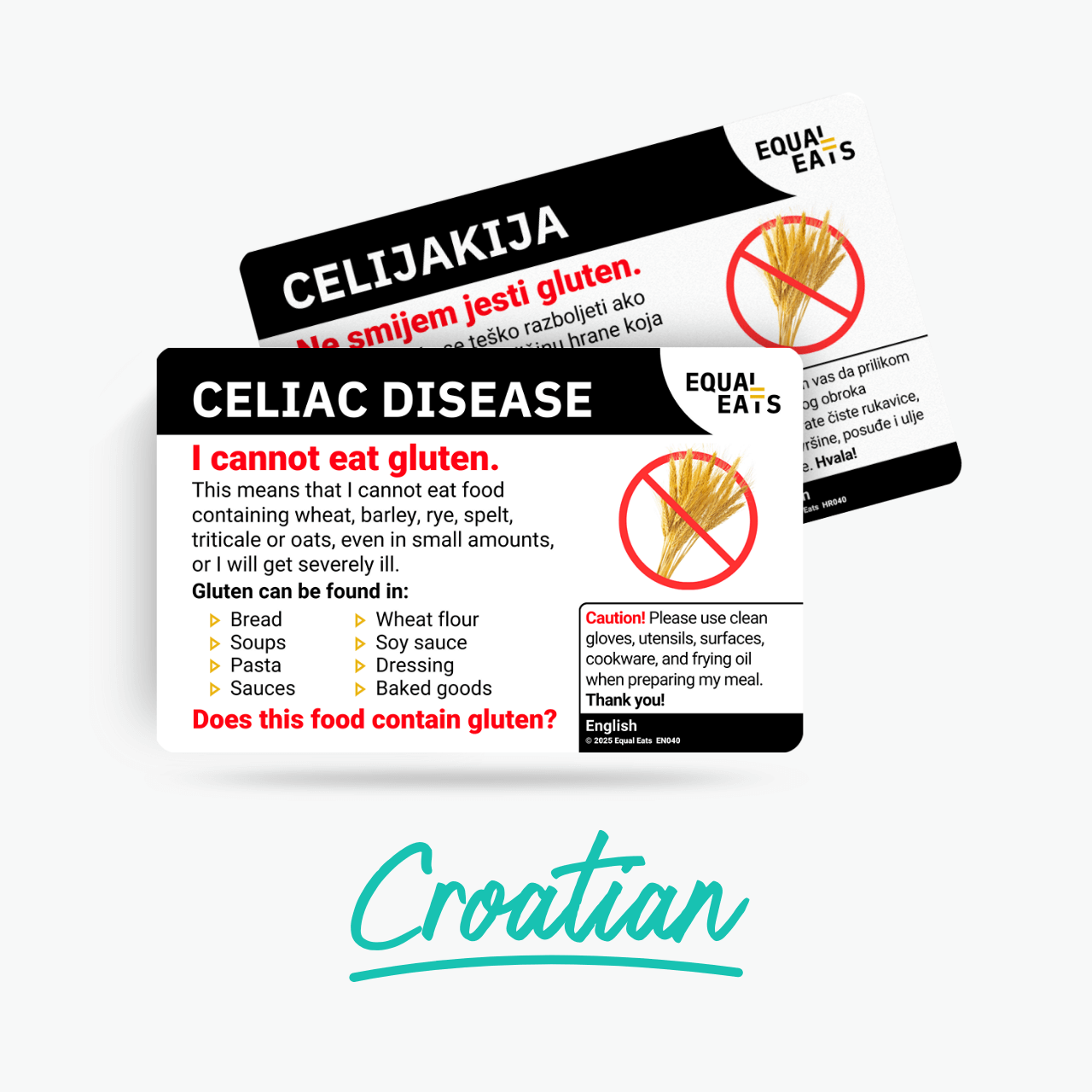 Our Croatian celiac disease cards help ensure your gluten restrictions are truly understood at restaurants. By providing a description of celiac disease, a list of foods containing gluten, and a note warning about cross-contact, this card can easily become a staple in your passport case.