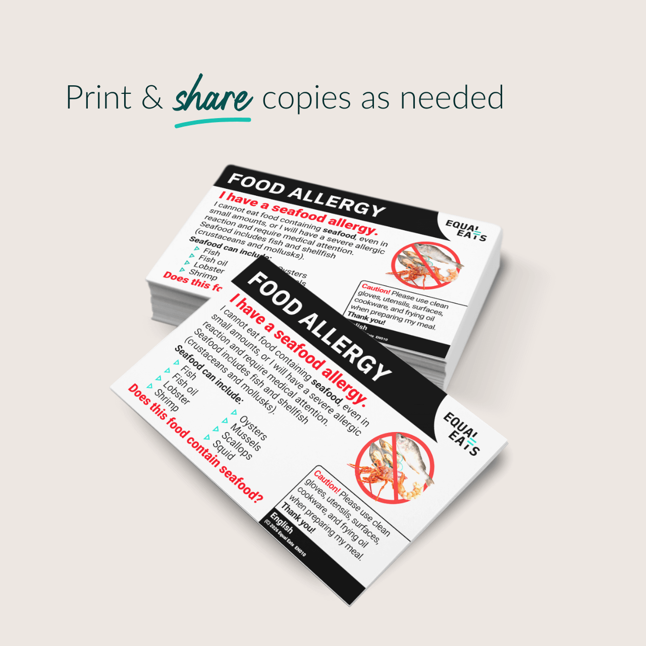 Get an instant download translation card for your seafood allergy and dine with less worry! Seafood allergy cards can help others understand your allergy to fish and shellfish so you can eat safer at restaurants.