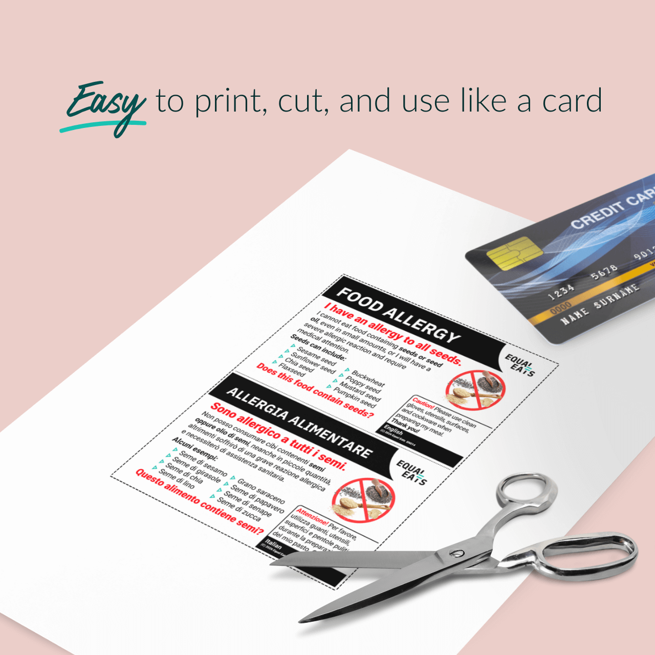 Get an instant download translation card for your seed allergy and eat with less worry! Seed allergy cards help others understand your allergy to sesame seeds, chia seeds, pumpkin seeds, poppy seeds and more, so you can eat safer at restaurants.