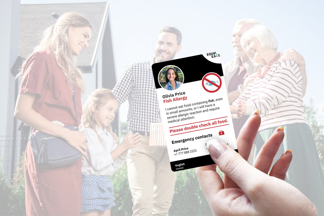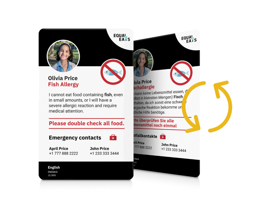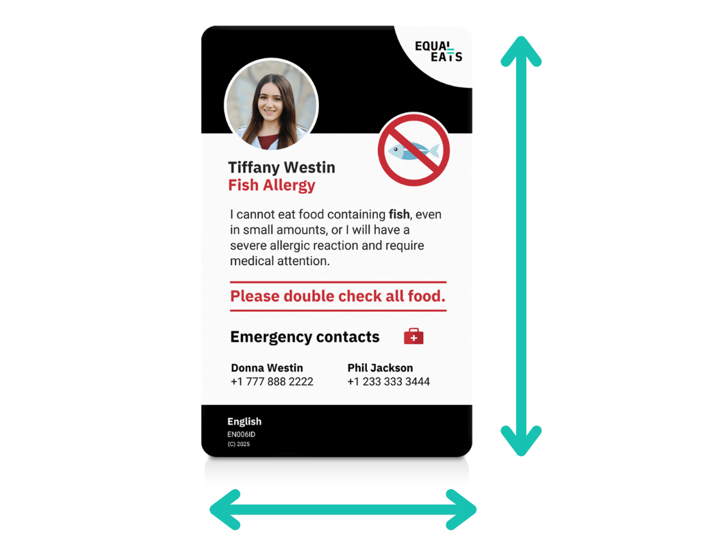 A shellfish allergy emergency ID card has been designed to give you peace of mind, providing details of your allergy and emergency contacts should the need arise. Great to use at work, for caregivers such as nursery, school and relatives and when travelling.