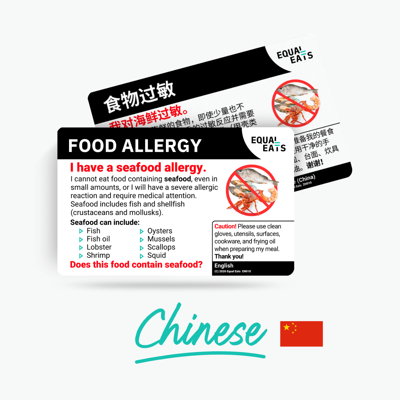 A seafood allergy card in Simplified Chinese helps bridge the communication gap, ensuring your request is noted, remembered, and understood.
