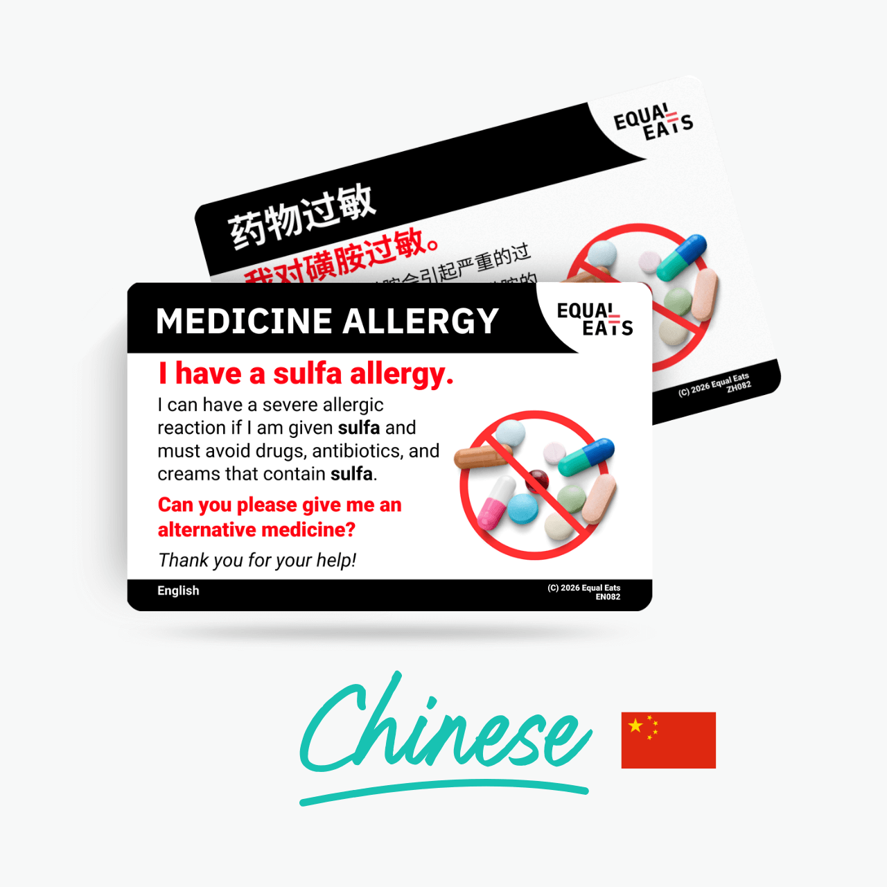 A sulfa allergy card in Simplified Chinese helps bridge the communication gap with healthcare workers, ensuring your medical condition is noted, remembered, and understood.