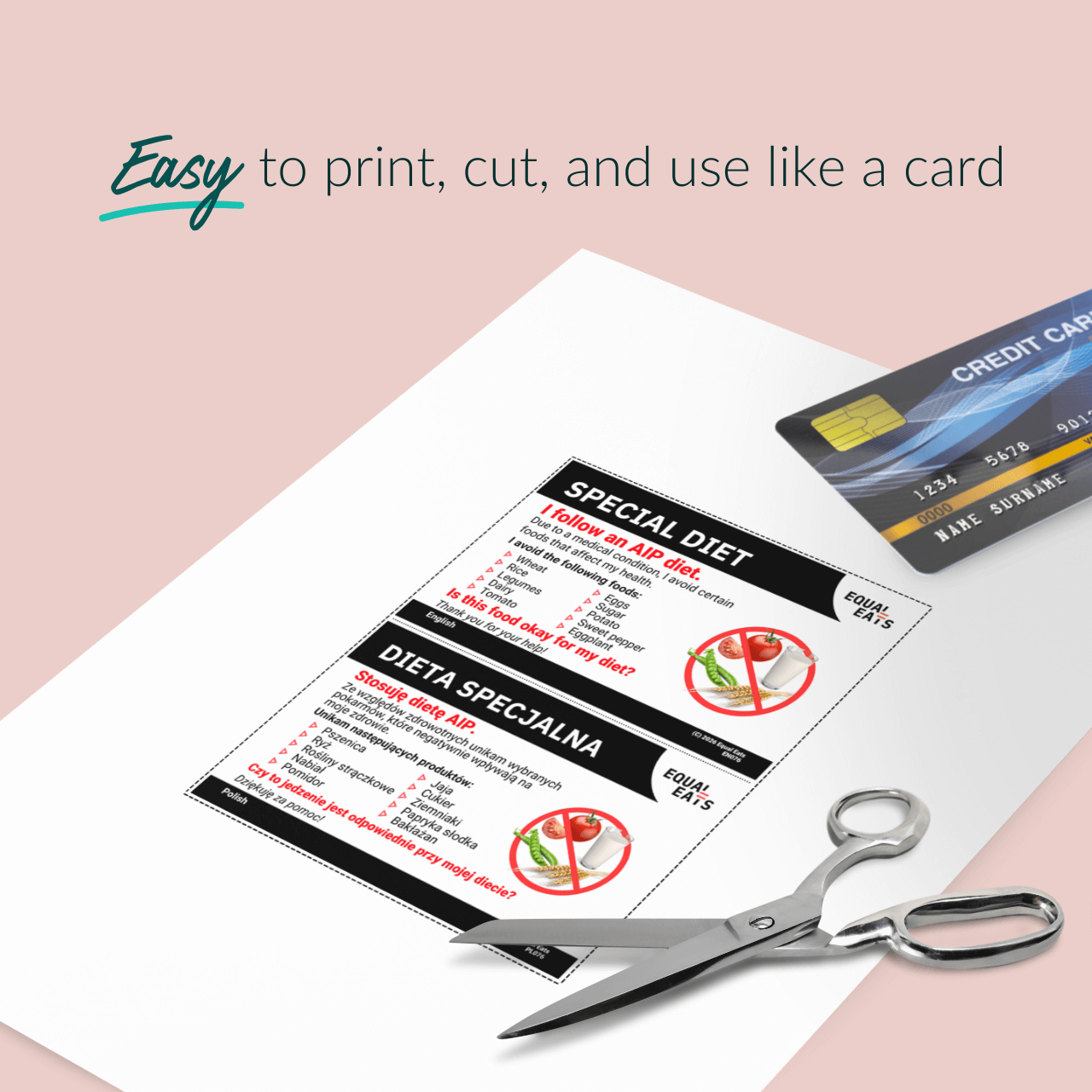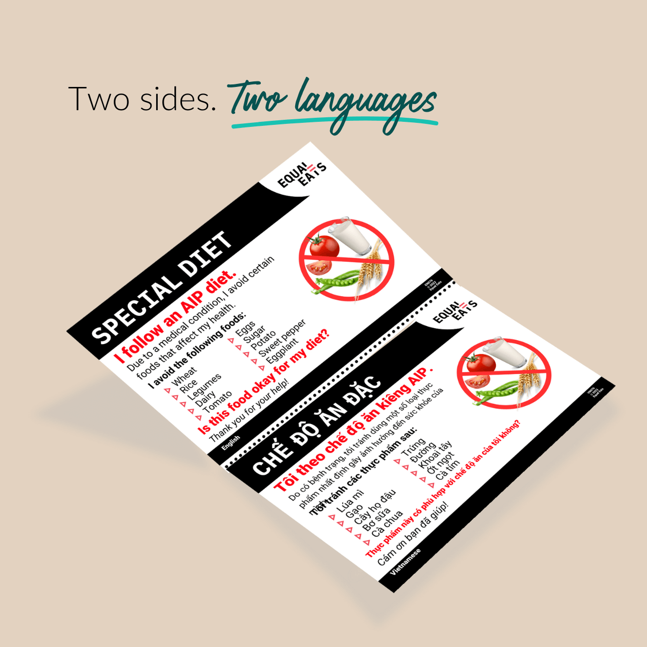 Stick to your AIP diet plan while travelling with an Equal Eats translation card.