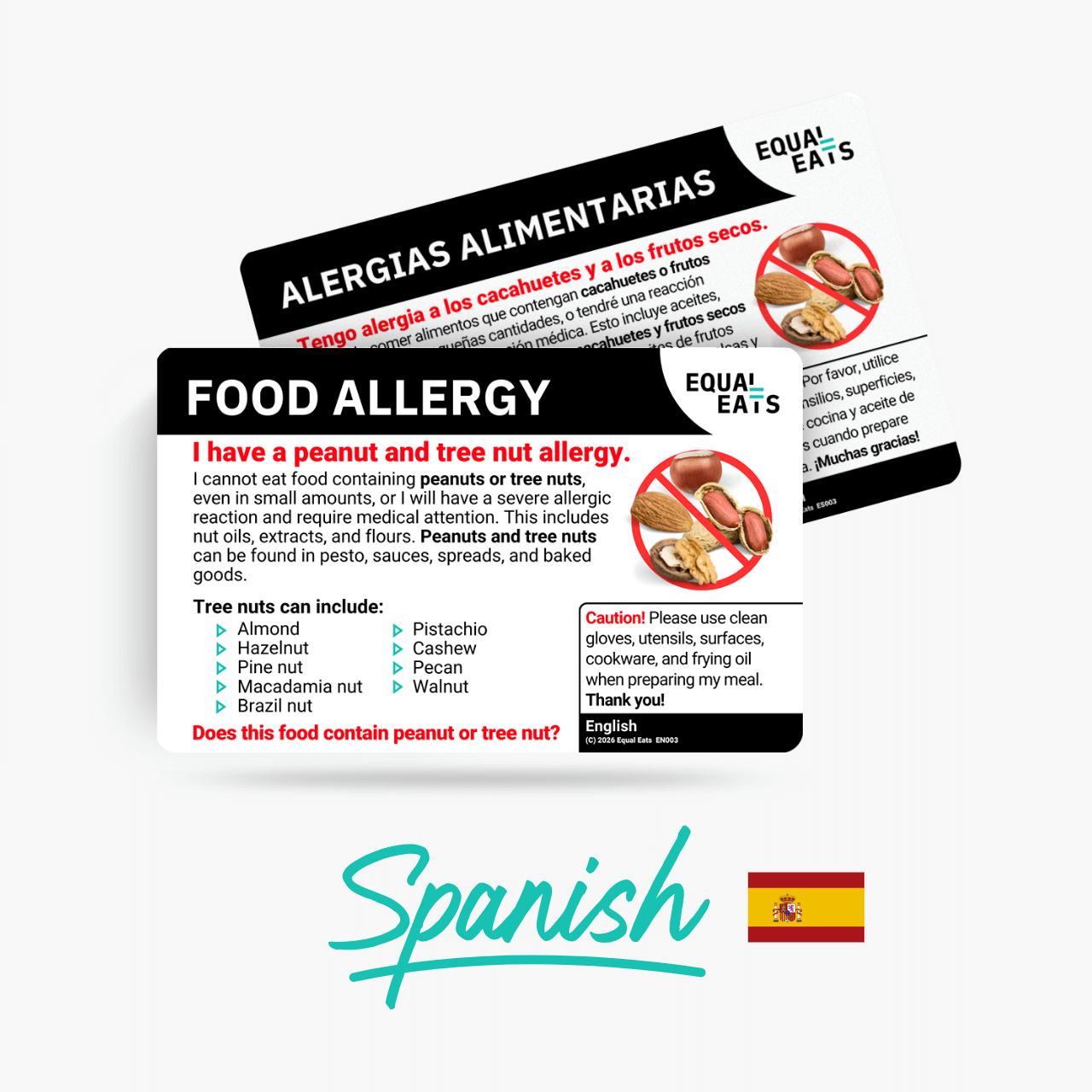 Get an accurate translation of peanut and nut allergy in Spanish with an Equal Eats card.