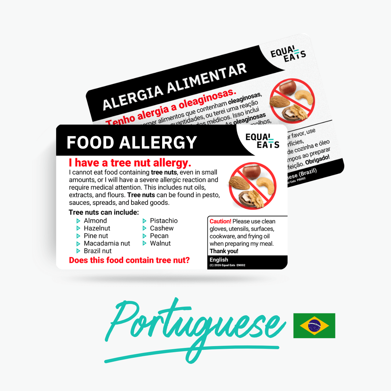 Get an accurate English to Portuguese translation of nut allergies with an Equal Eats card. We use translations specific for Brazil instead of Portugal.